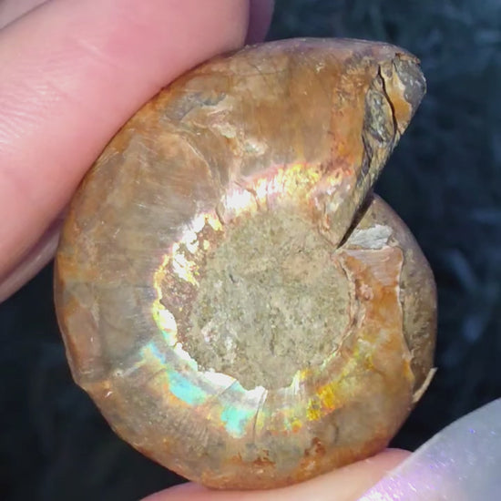 This unique fossil has preserved nacre which creates an iridescent shimmer on the outer shell - Nacre is an organic–inorganic material mostly composed of Aragonite platelets produced by some moluscs and is also the material that pearls are made up of.