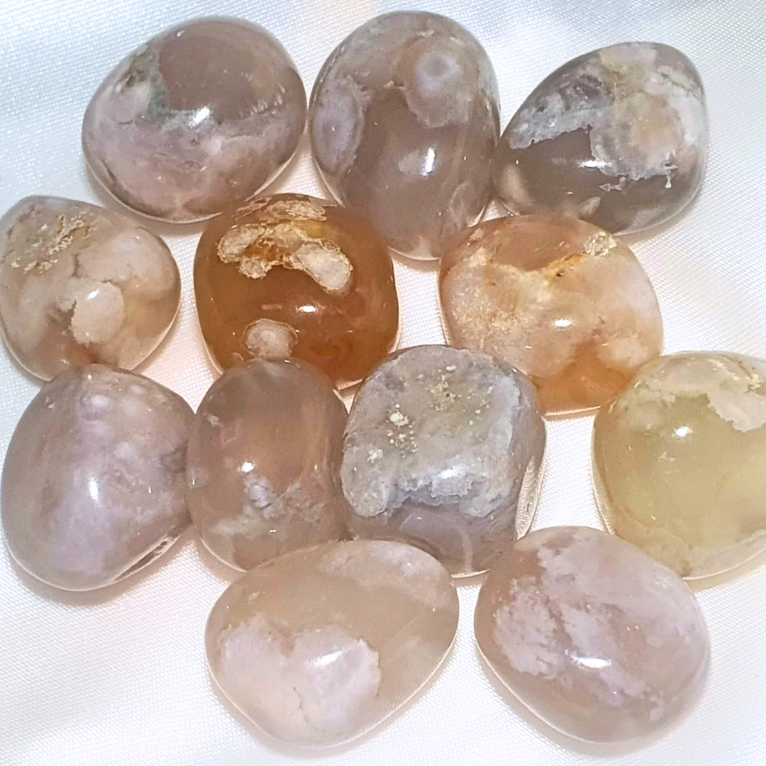 Gorgeous natural Flower Agate crystal tumbles (each sold separately) packaged in a reusable organza bag for storing your crystals or jewellery