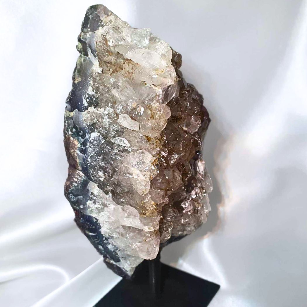 This large Smoky Quartz has golden Cacoxenite inclusions (one of the elements of Super Seven) and rainbows in its large crystals with natural blue Agate edge attached to a metal stand which makes this a great unique display piece.