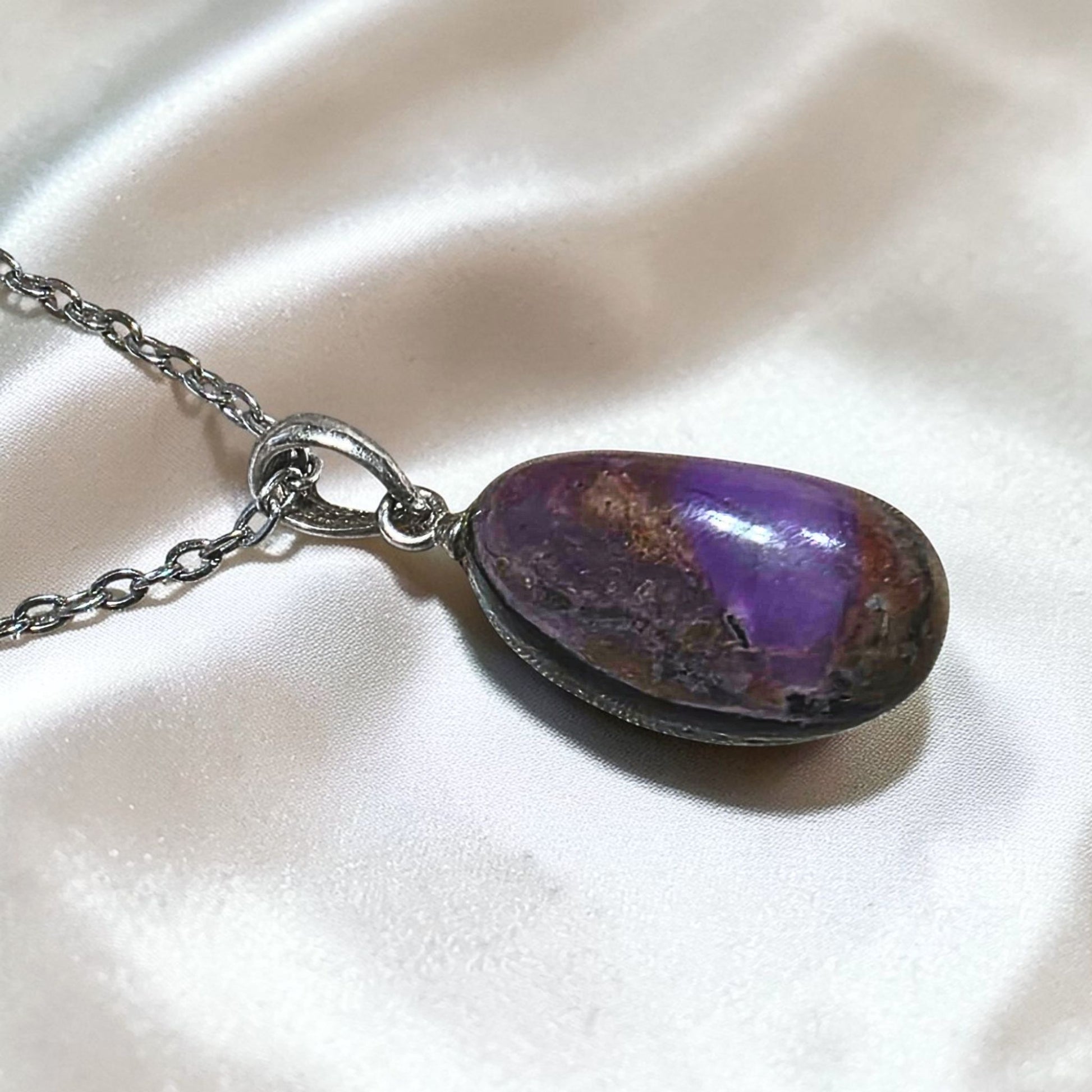 This natural Sugilite pendant has rich purple tones with earthy matrix and a metallic manganese and iron back finished with a sterling silver bail and paired with a hypoallergenic stainless steel chain (packaged in a jewellery pouch).