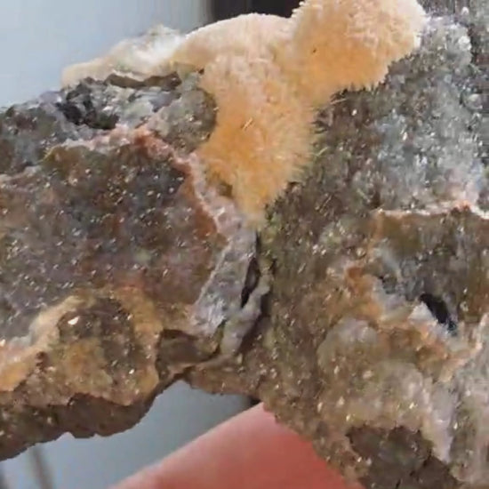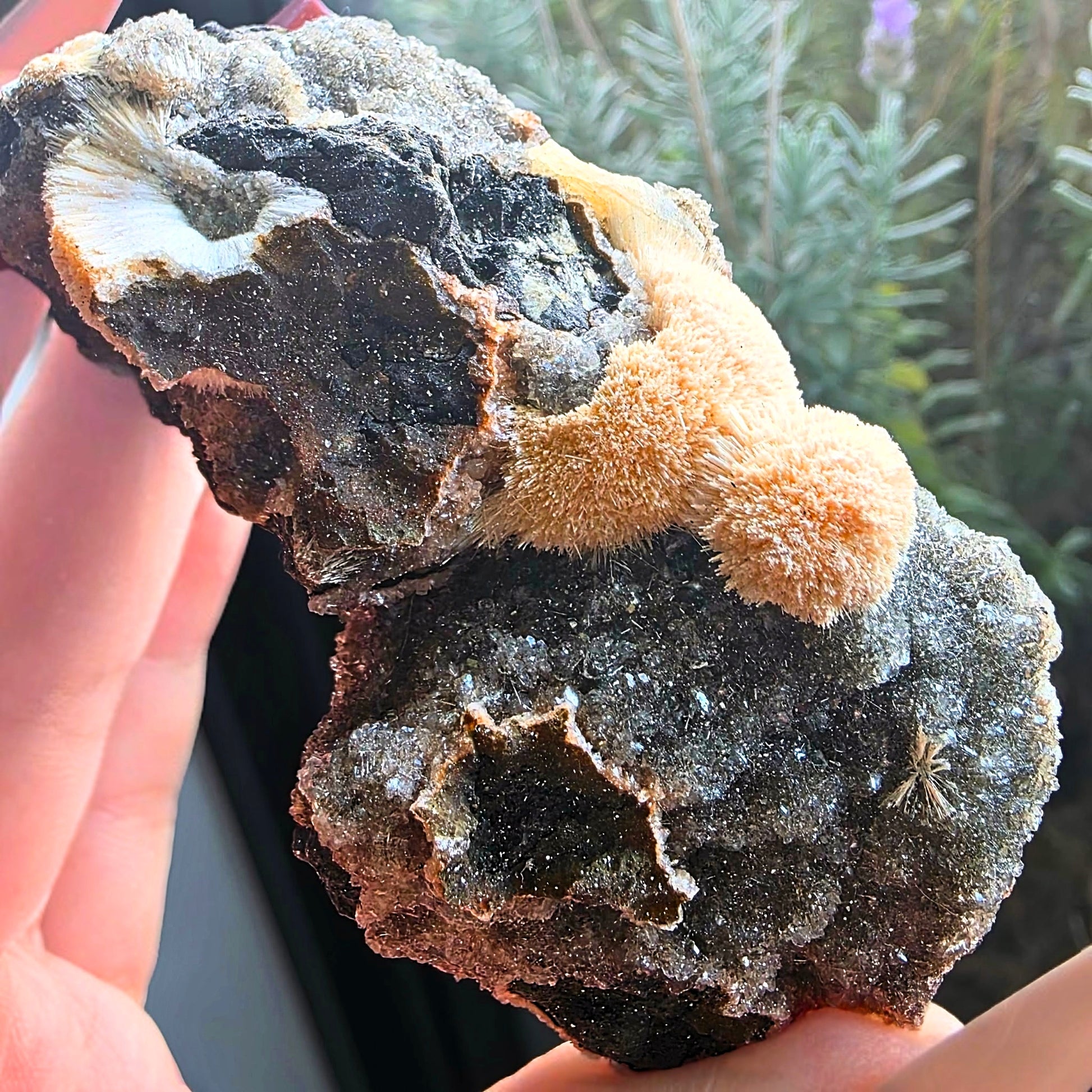 This rare specimen cluster has natural orange Thomsonite and white sprays on a sparkling druzy Black Chalcedony base - formed via volcanic activity over 600 million years ago