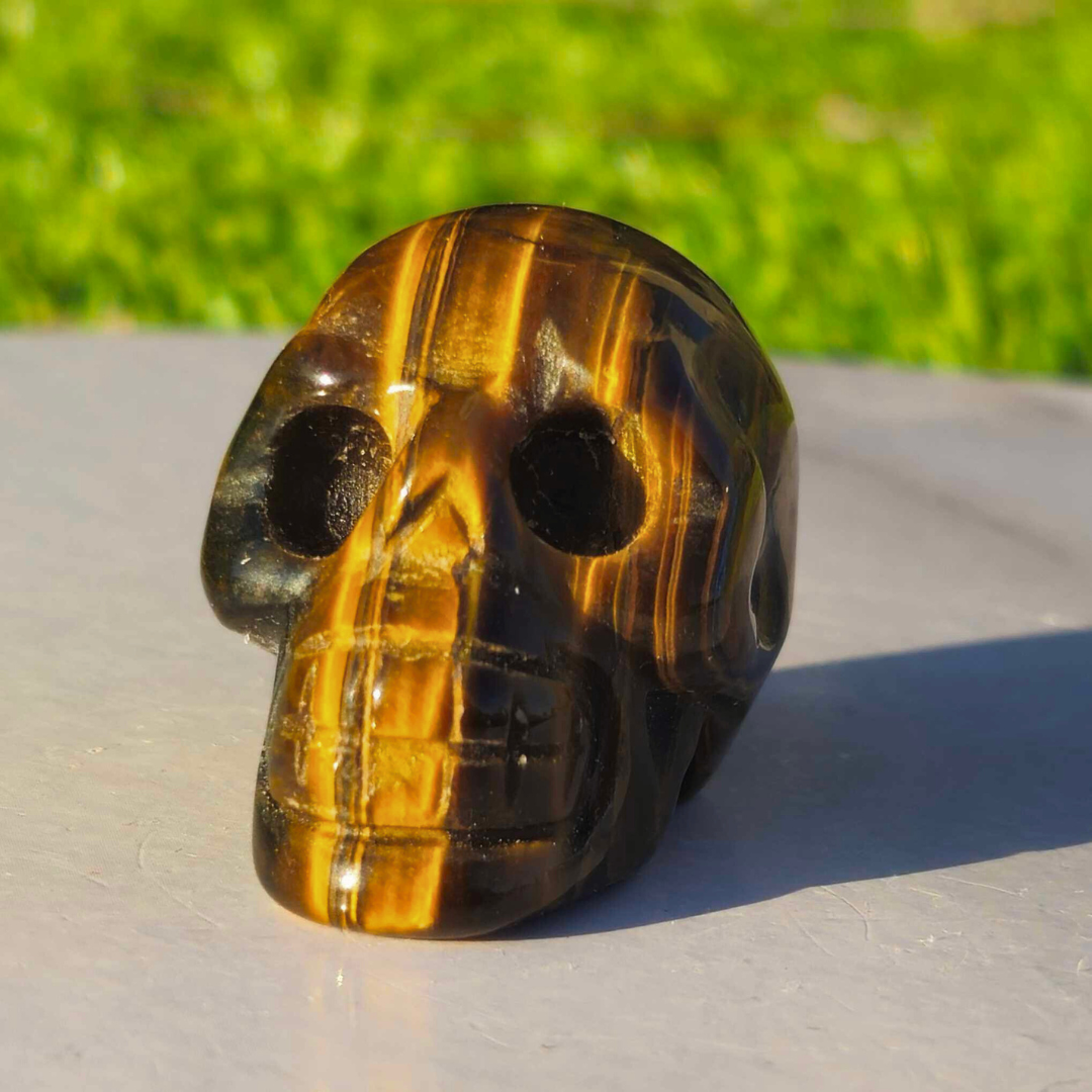 An amazing high grade Tiger's Eye polished skull carving with a high gold-brown flash
