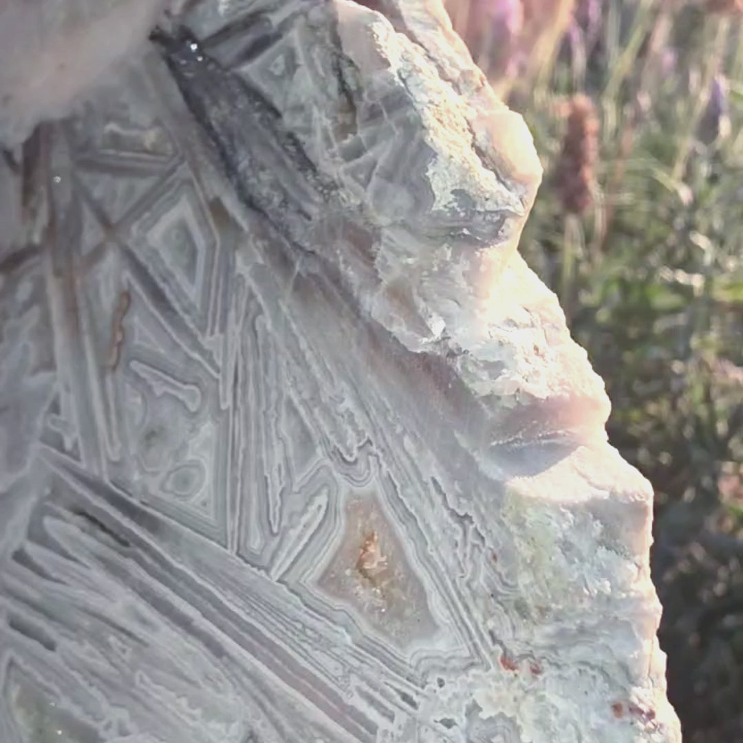 This unique Plume Agate slab has white and grey banding with sparkling open Quartz sections  - from Indonesia - this crystal slab comes with a slab holder