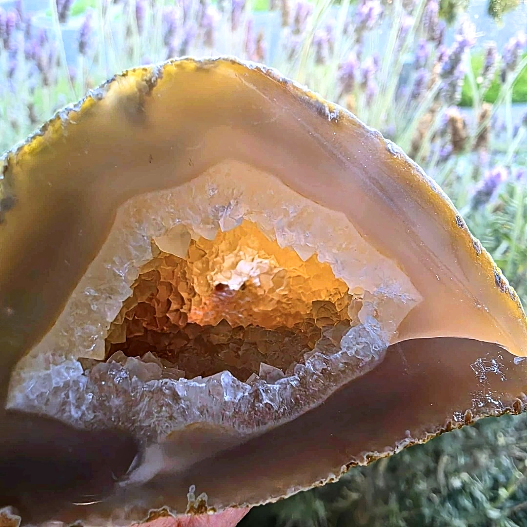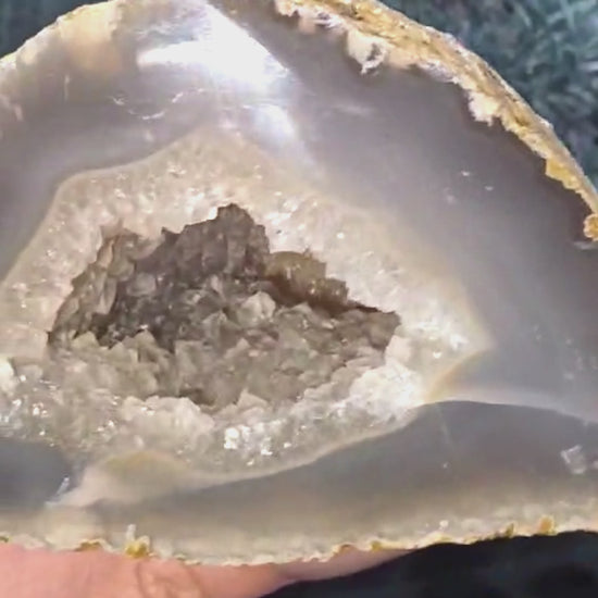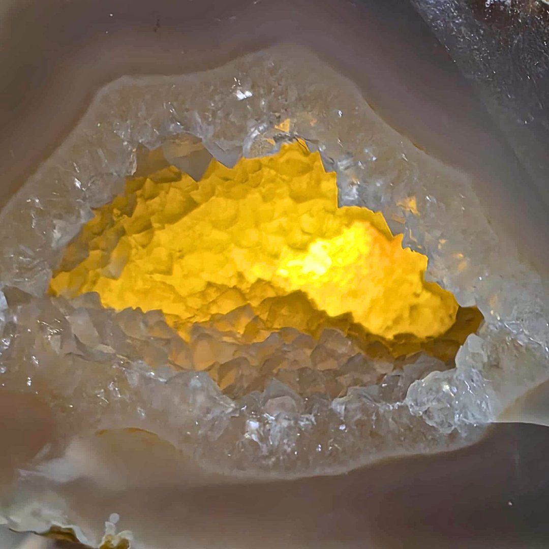 This unique Agate geode has a polished surface with a translucent natural blue-grey colour and opening with semi-matte crystal points. The geode can also be lit up with a backlight