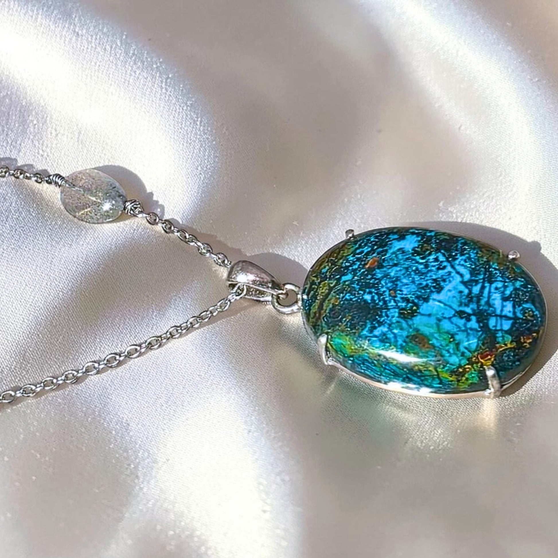 This rare Shattuckite necklace has a combination of vibrant blue, black and green colours in a sterling silver setting - includes a hypoallergenic stainless steel chain with a labradorite crystal.