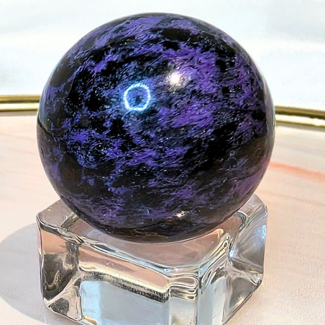 This beautiful high grade Charoite crystal sphere has the vibrant characteristic purple and cream colours with black Aegirine inclusions, yellow Tinaksite and Mica needles that add a shimmer throughout - a mineral found at the same time as Charoite - difficult to find in a sphere form - includes stand