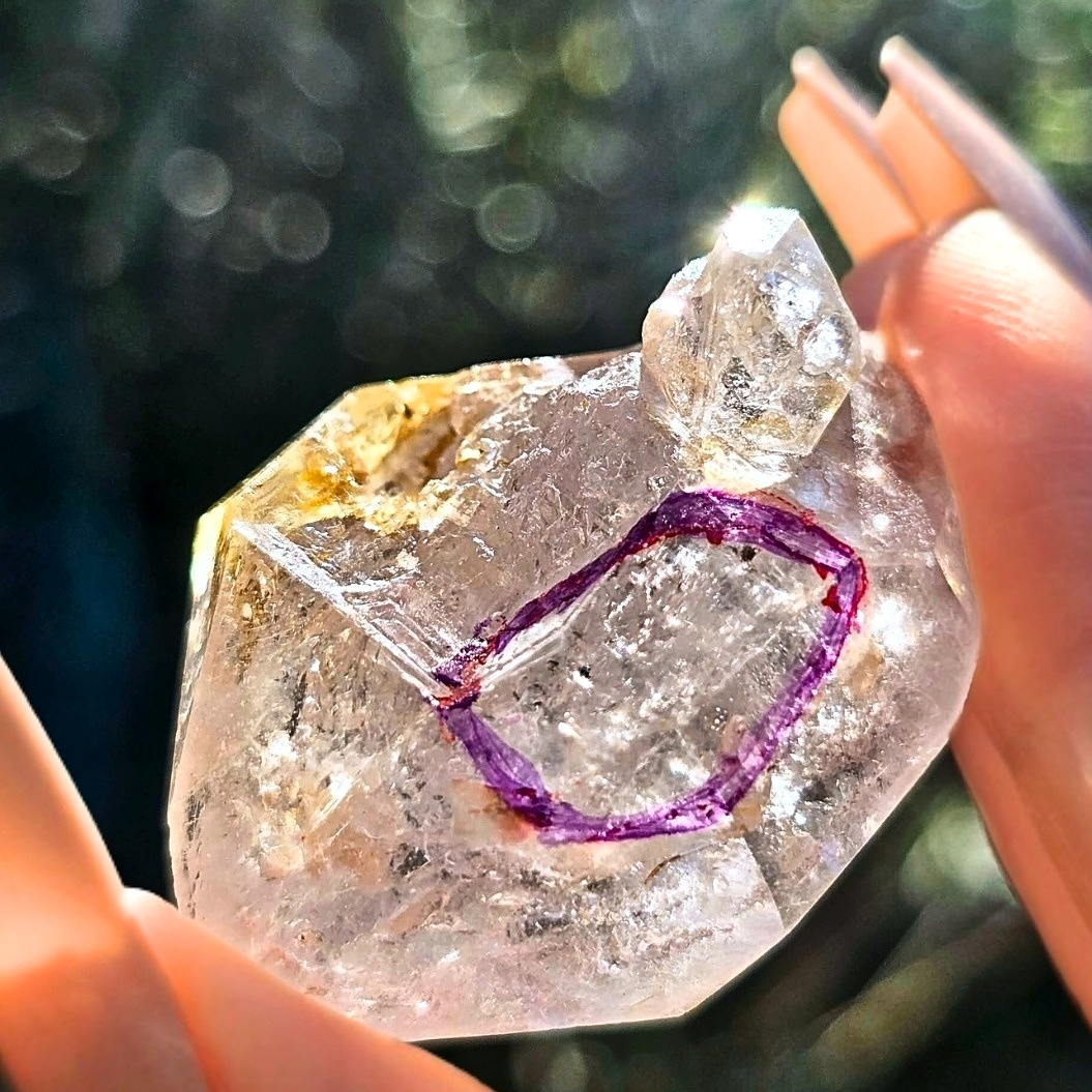 This beautiful rare Skeletal Quartz double terminated enhydro has a top crystal with a moving carbon inclusion and central rainbow in circled area.