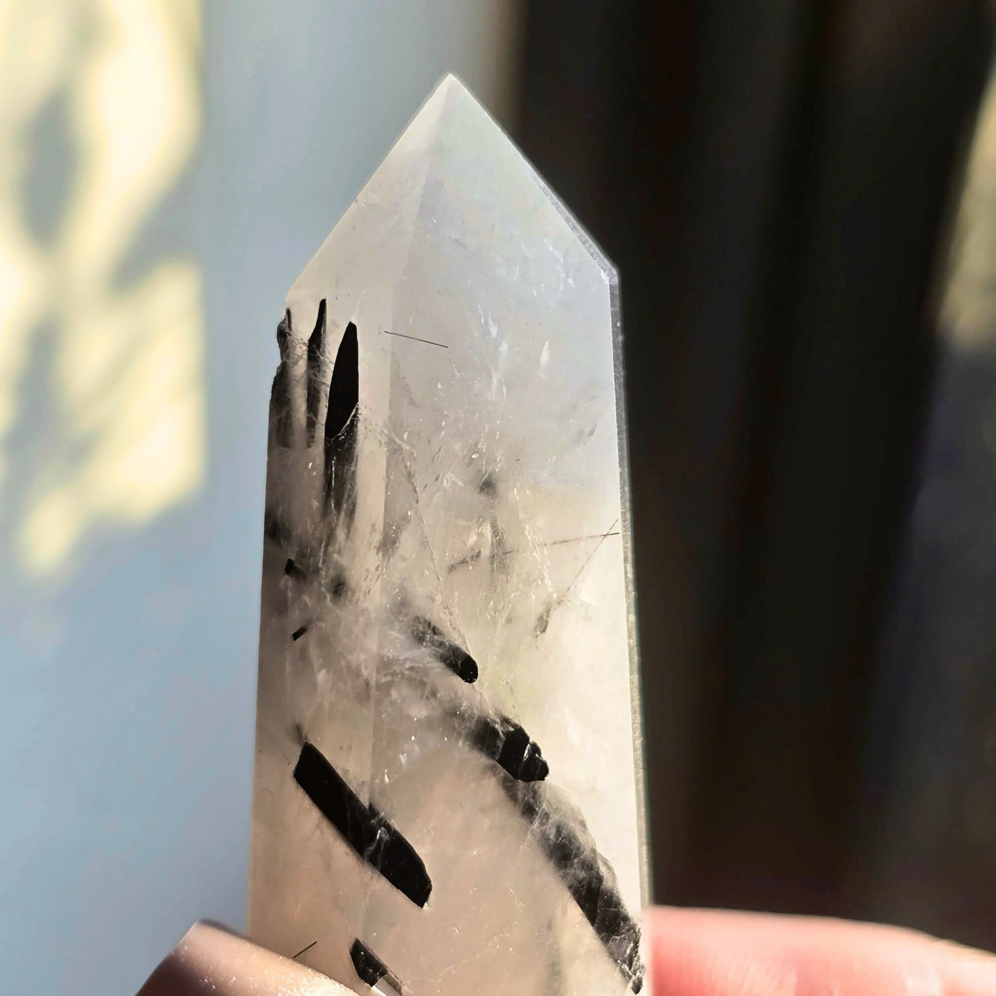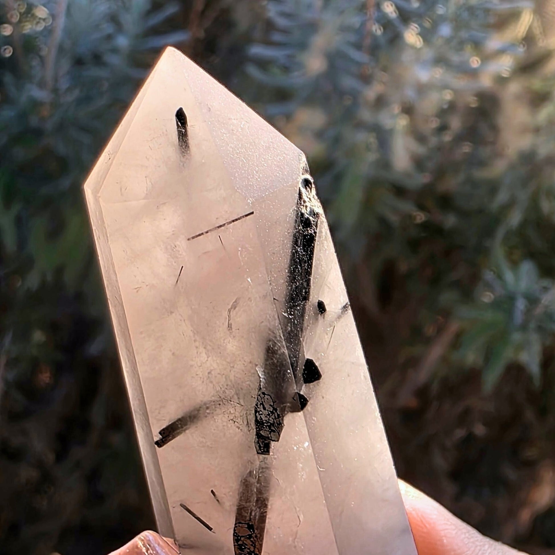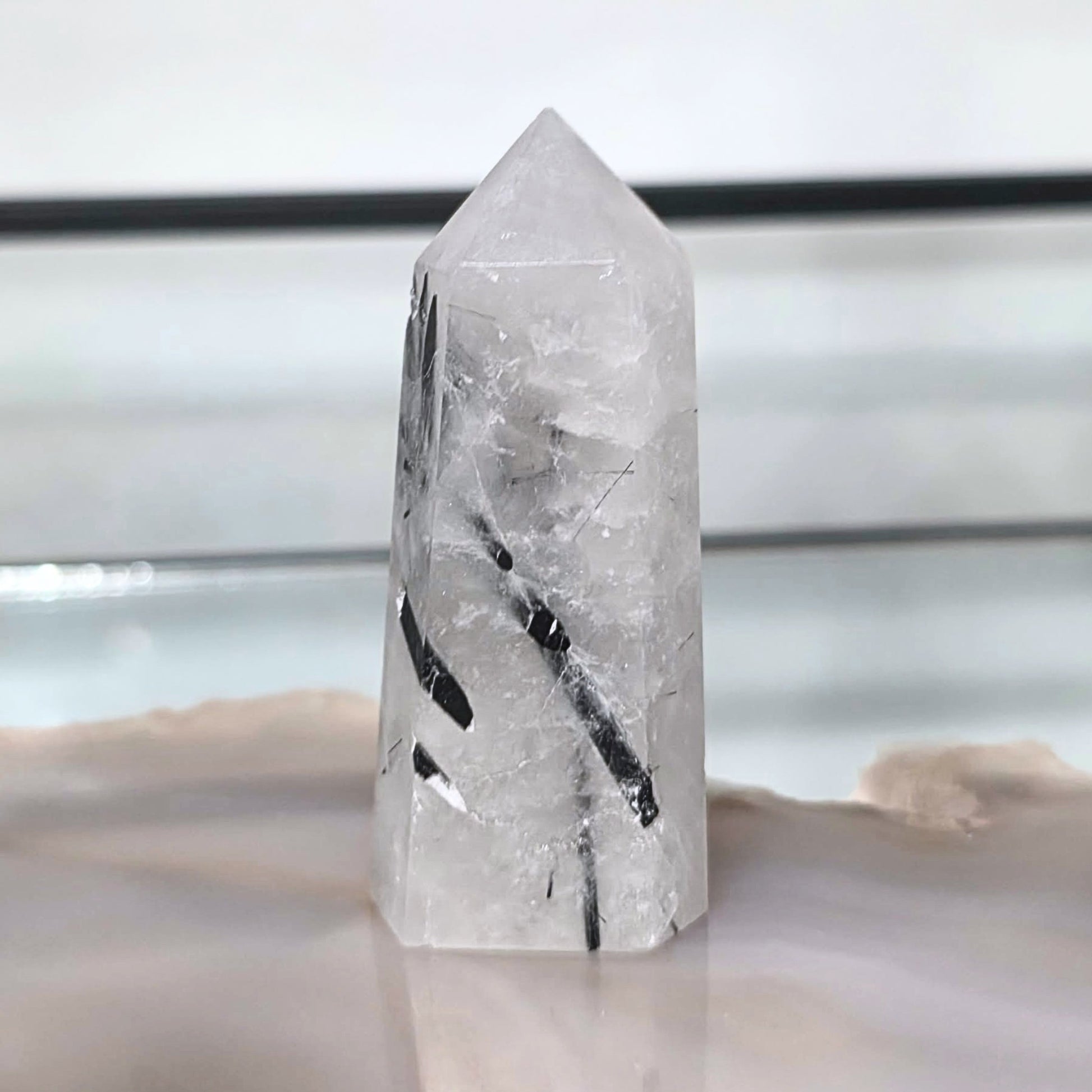 This unique crystal tower has Black Tourmaline blades formed throughout Clear Quartz.
