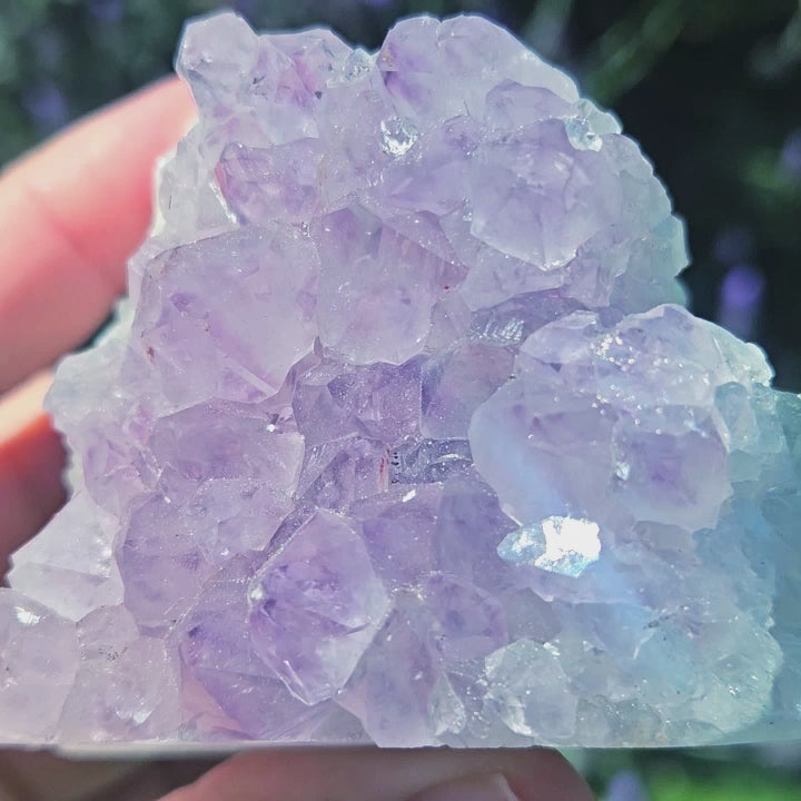 This Amethyst cut base has sparkling light purple crystal points and Quartz from Brazil.