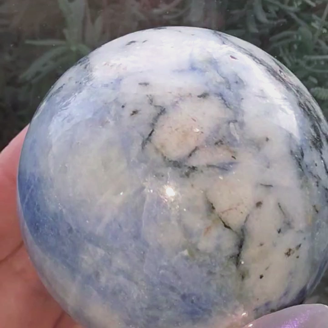 This genuine rare Afghanite sphere has a pastel blue colour from lazurite combined with Quartz and Black Tourmaline inclusions - from Russia