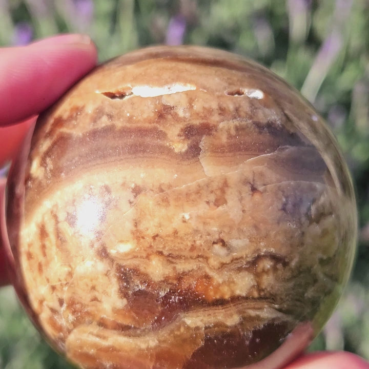 This amazing Chocolate Calcite (Brown Aragonite) sphere has different shades of brown with dark brown banding throughout - stand is included.