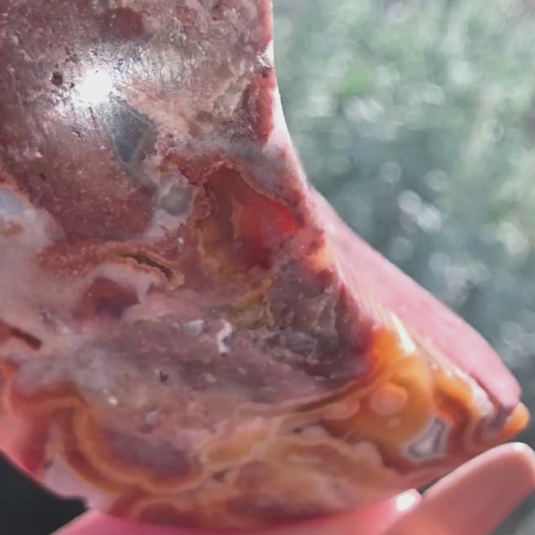 Crazy Lace Agate (also known as Mexican Agate) is a banded chalcedony -a micro-crystalline Quartz that contains Iron and Aluminium and is often brightly coloured with 'crazy' swirly patterns.