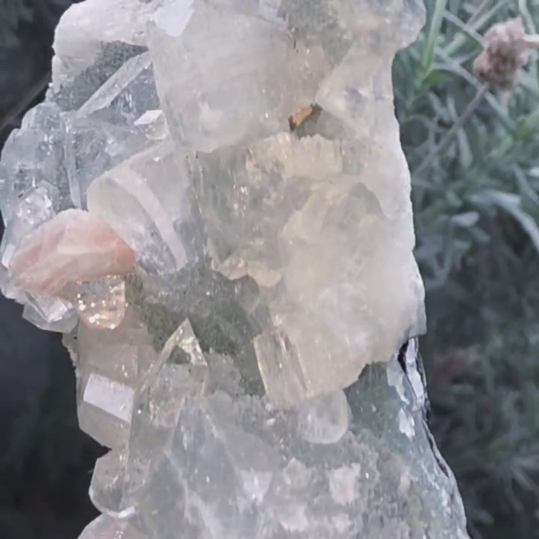 A beautiful cluster with clear Diamond cubic Apophyllite with peach Stilbite on sparkling grey Chalcedony - the cluster has high clarity and rainbows