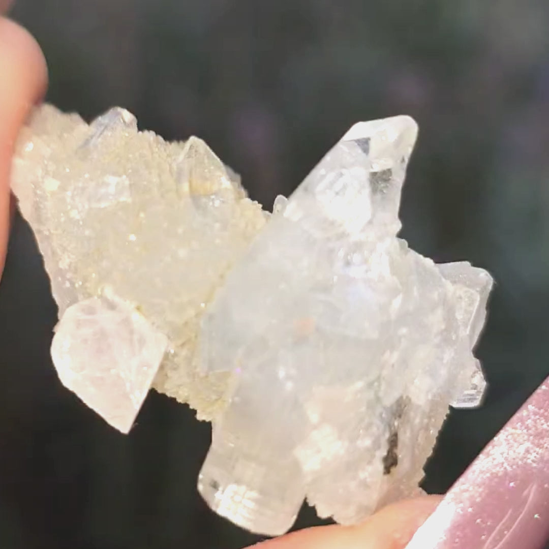 A beautiful crystal cluster with diamond-glass Apophyllite on grey Chalcedony