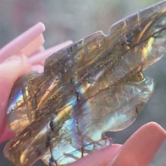 This high grade leaf carving has bright blue, green and yellow flashes on both sides