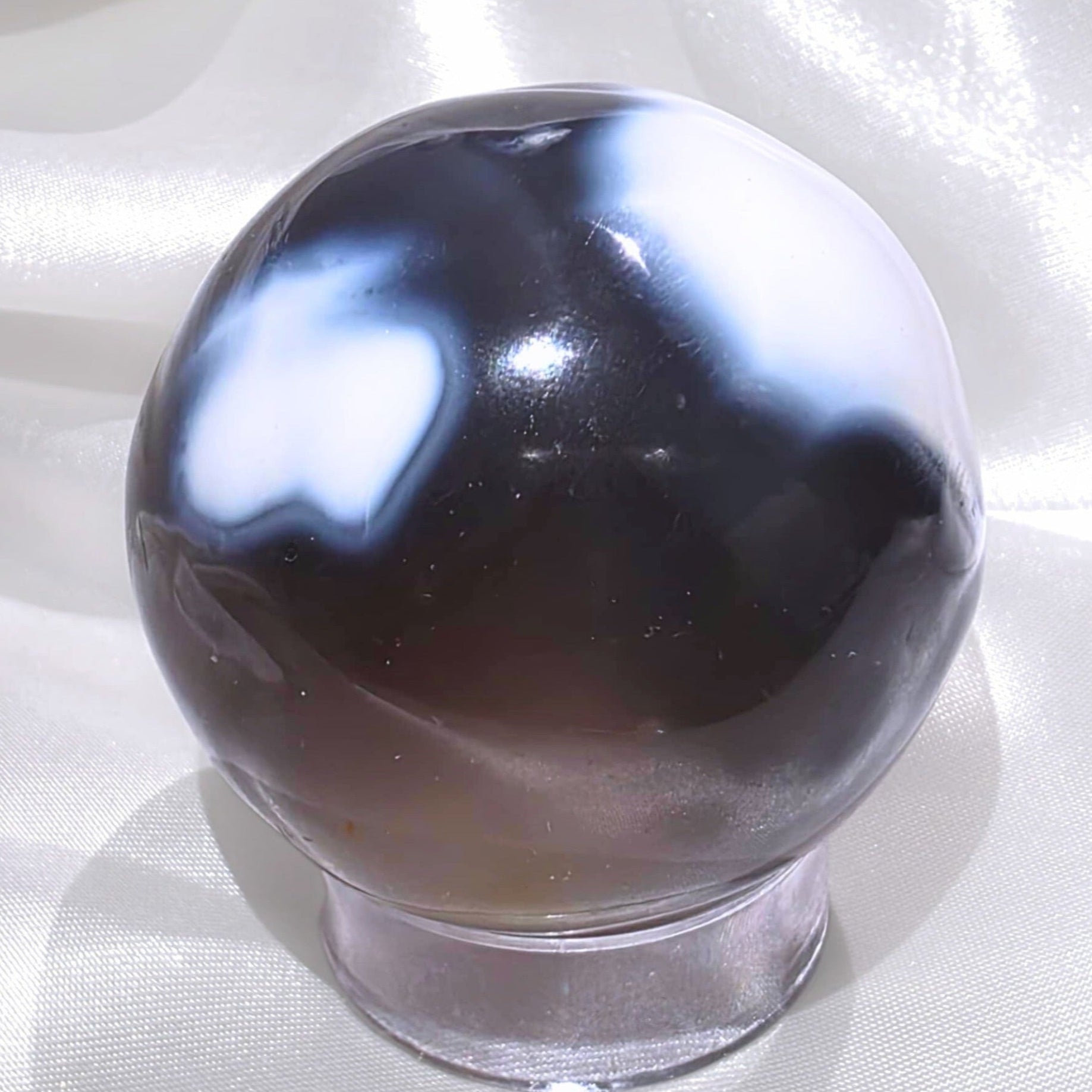 This unique Orca Agate crystal sphere has a translucent natural deep blue-black and white swirls with a gradient yellow shade