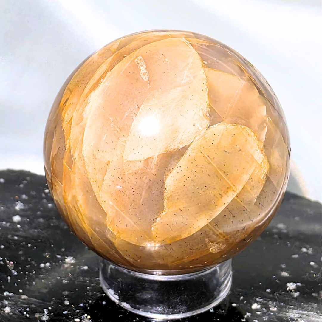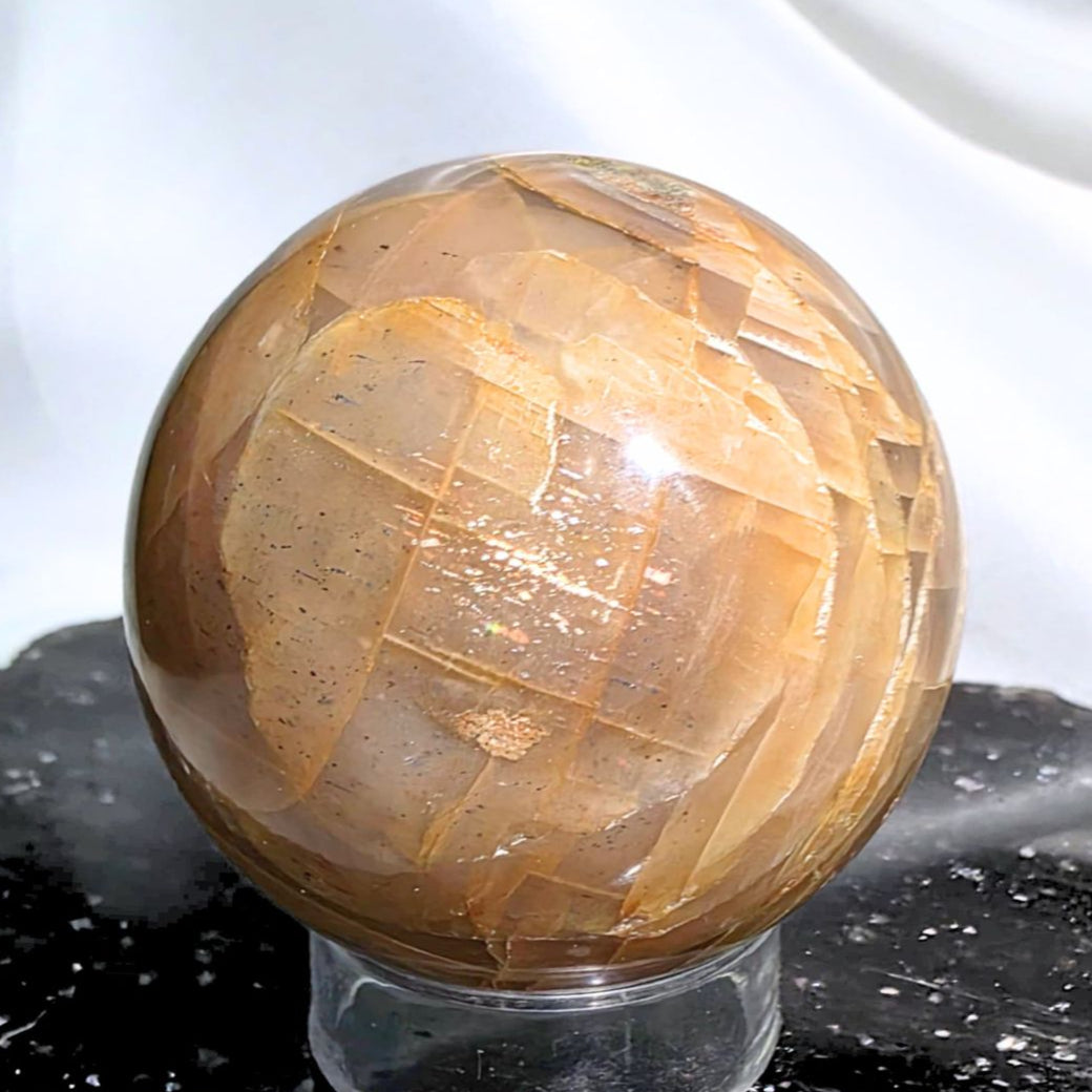 This Peach Moonstone sphere has a combination of light and dark layers of Feldspar crystal with a silver sheen and a central rainbow shimmer - includes sphere stand