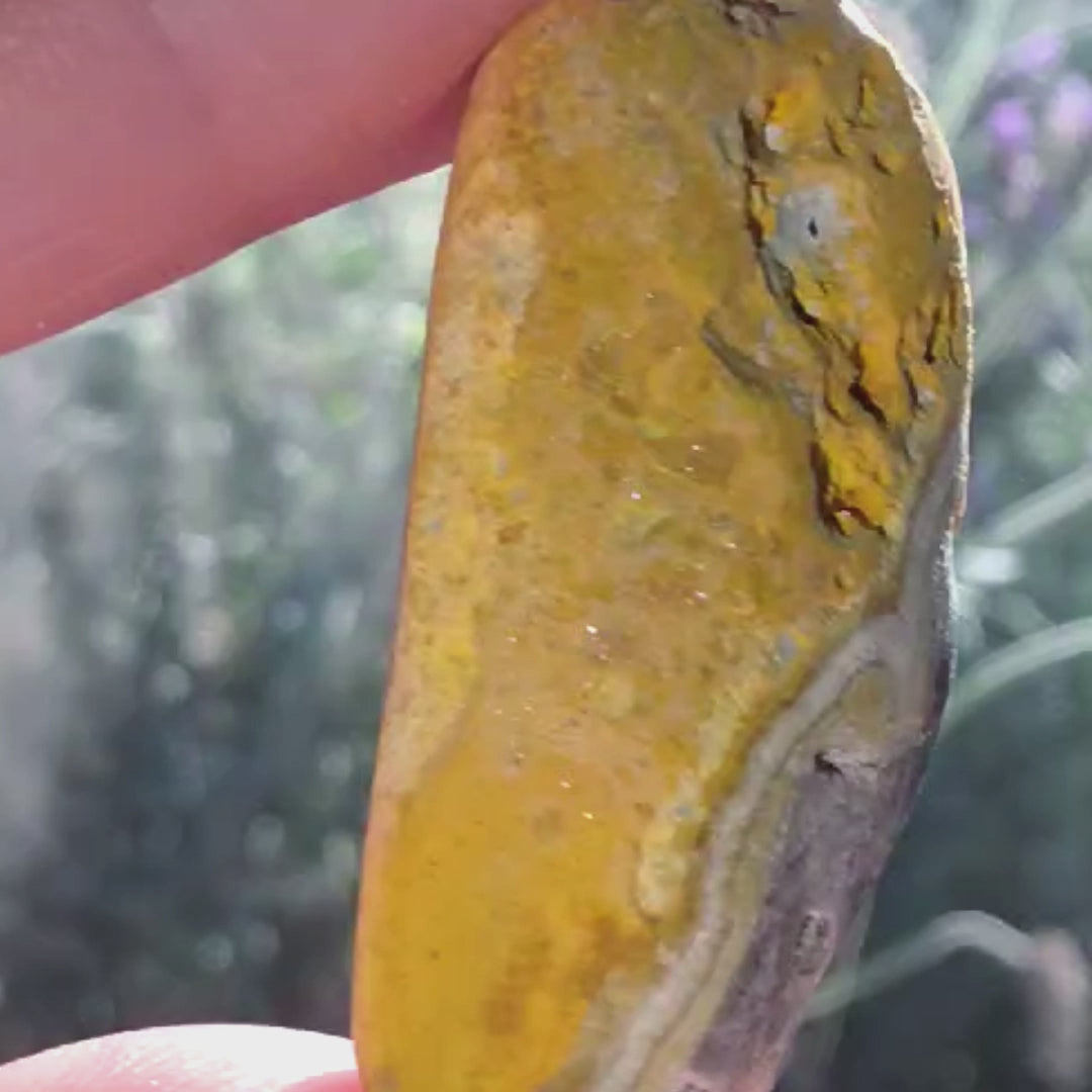 Bumblebee jasper is only from the volcanic regions of Mount Papandayan in West Java, Indonesia. It is a combination of Sulfur forming the yellow and orange while Hematite and volcanic ash form the black and gray bands.