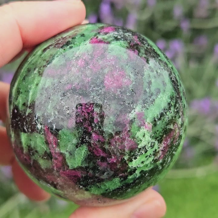 This Ruby in Zoisite sphere has red ruby crystals that can be seen all around within green zoisite.