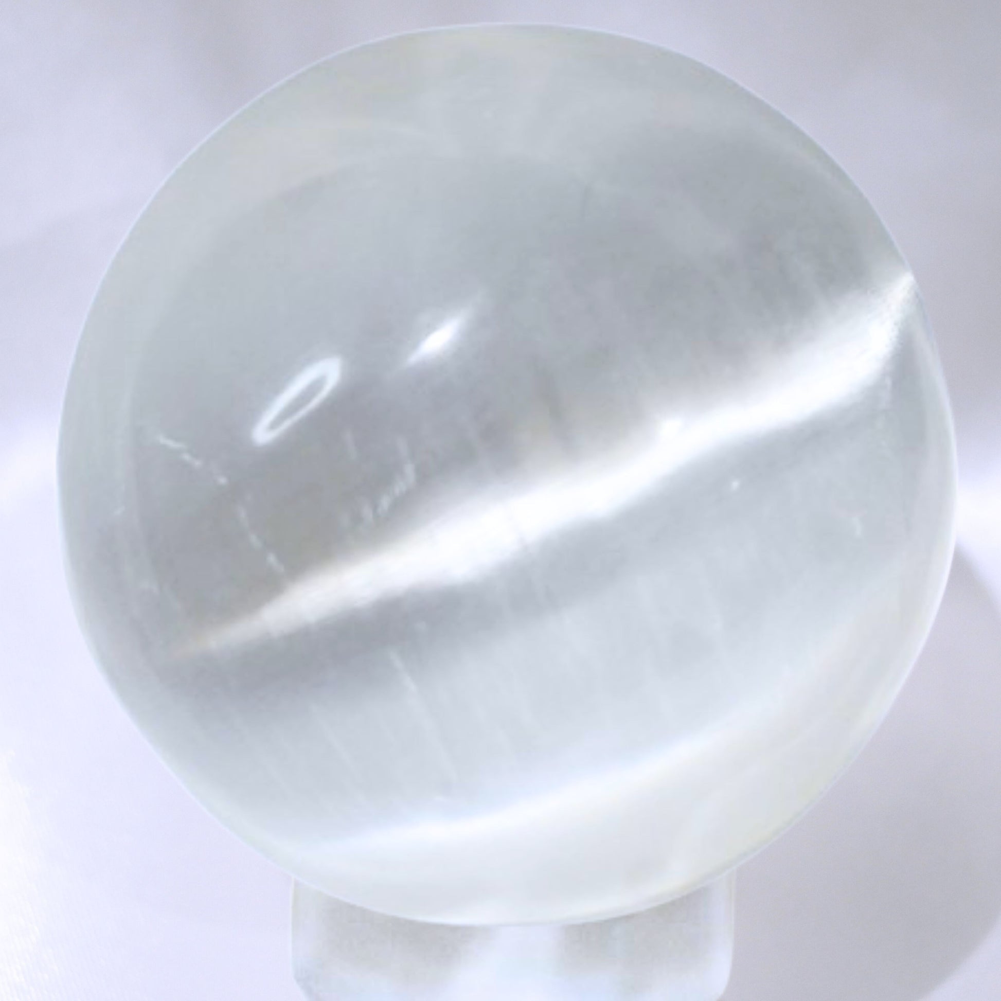 A Selenite Sphere with a high silver-white sheen and includes a sphere stand.