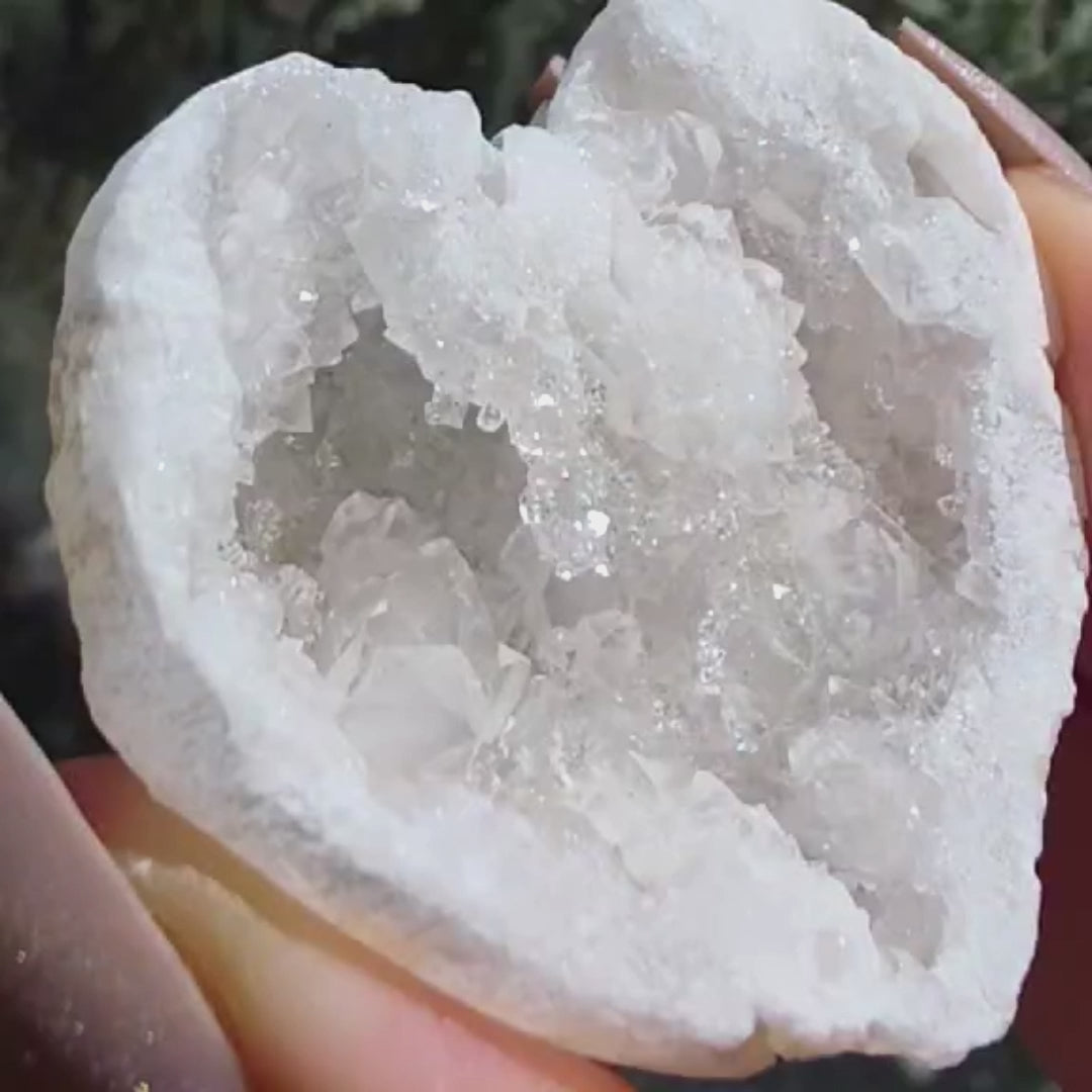 This crystal geode heart carving contains numerous sparkling Quartz crystals and mini stalactite formations that resemble fine sugar crystals