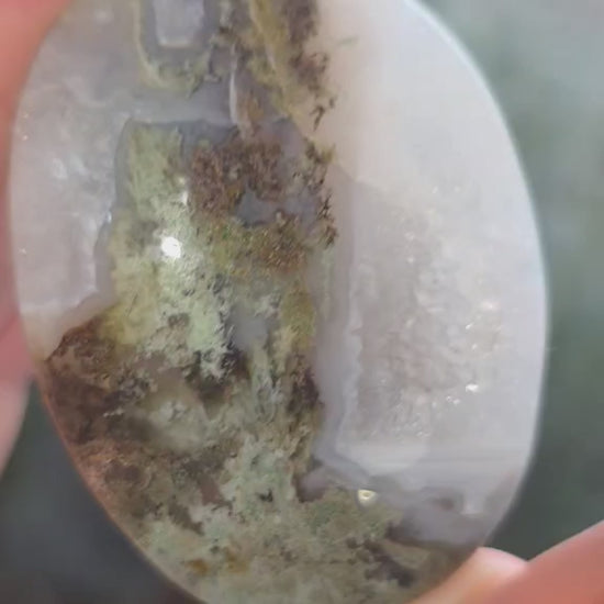 This beautiful high grade scenic Moss Agate crystal palm stone with druzy quartz openings in the naturally blue chalcedony and different shades of green moss-like inclusions.